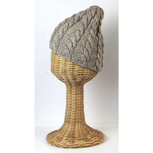 ぐるりとねじった様な連続模様の縄編みキャップ。 すっぽりかぶって、余った先っぽのとんがりがユーモラス。杢調の落ち着いたトーンならどの色を選んでも肌馴染みが良い。