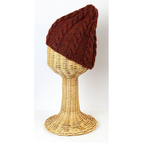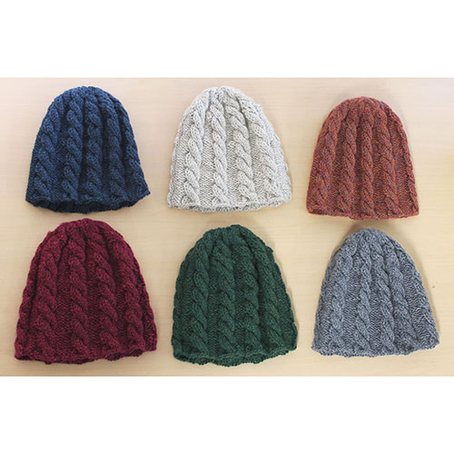 ぐるりとねじった様な連続模様の縄編みキャップ。 すっぽりかぶって、余った先っぽのとんがりがユーモラス。杢調の落ち着いたトーンならどの色を選んでも肌馴染みが良い。