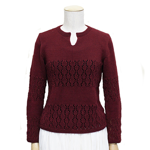 エレガントにもカジュアルにも着こなせるオープンフロントネックのセーター。 大人の装いが似合うノーブルなワインレッドは肌写りの良い深い色です。 素材:ウール100%(エクストラファインメリノ100%使用) 使用針:棒針6号 5号 サイズ:胸囲92cm 着丈55cm 背肩幅38cm 袖丈54.5cm ヨーロッパの手あみ掲載作品 * 同品種(アルバ)での、お色変更も可能です ご希望の場合は、コメント欄にお色変更の詳細を入力してください(在庫がある色に限ります)