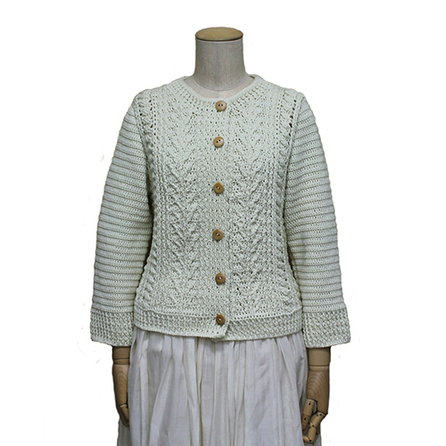 かぎ針あみのアラン模様カーディガンです。ツリーやケーブルは棒針編みとは少し違った雰囲気です。