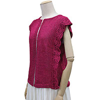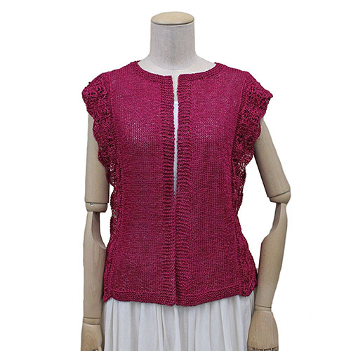 数量限定の完成品販売!(なくなり次第終了) サンプルSALE 超特価! 爽やかな着心地が抜群のコットン100%のテープヤーンを使用しています。 肩から裾に続く揺れるフリルが腕やウエストラインを美しく魅せてくれます。 (1点1点手作りしています) 素 材:コットン100% サイズ:胸囲92cm 着丈55.5cm 裄丈23cm * サンプル品のため特別価格になっています