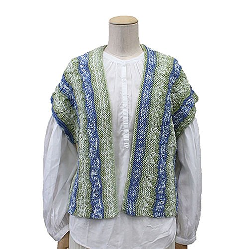 数量限定の完成品販売!(なくなり次第終了) サンプルSALE 超特価! 編み込みの様な模様が自然に現れるユニークな素材のベストは、スカラップレース模様でニュアンスをプラス。 増減の無い簡単な仕上げです。 (1点1点手作りしています) 素 材:ウール50%(エクストラファインメリノ100%使用) アクリル50% サイズ:胸囲96cm 丈50cm * サンプル品のため特別価格になっています