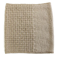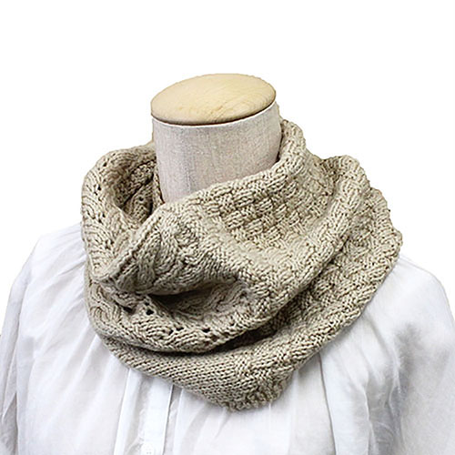 表と裏の地模様、交差、透かし編みをランダムに配したパッチワーク風のスヌードです。