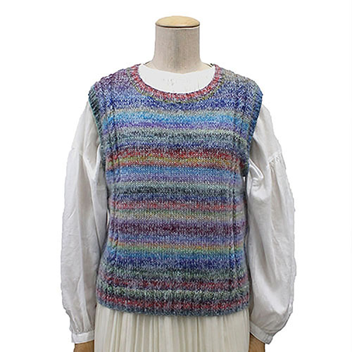 数量限定の完成品販売!(なくなり次第終了) サンプルSALE 超特価! 段染めの糸に繊細なモヘヤを引き揃えて、色も素材もふんわり優しい雰囲気のベストです。 素材感を活かしたシンプルなデザインです。 (1点1点手作りしています) 素 材:ウール71% モヘヤ23% ナイロン6% サイズ:胸囲86cm 着丈55cm * サンプル品のため特別価格になっています
