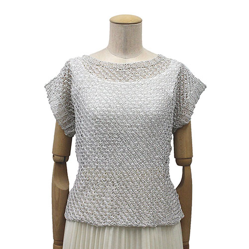 トリニティステッチという技法を使っています。上品なラメが輝く、テープヤーンを生かした涼し気な仕上がりです。
