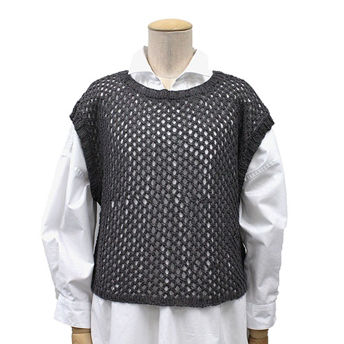 数量限定の完成品販売!(なくなり次第終了) アイレットレース模様のベスト。 身幅をたっぷり取ったデザインですが透け感タップリの編地なので程よくすっきりと着こなせます。 ノースリーブセーターとしても心地よくお楽しみ頂けます。 (1点1点手作りしています) 素 材:コットン80% シルク20% サイズ:胸囲110cm 着丈49cm 裄丈29.5cm * サンプル品のため特別価格になっています