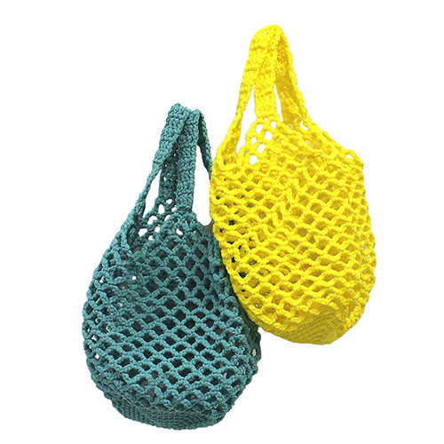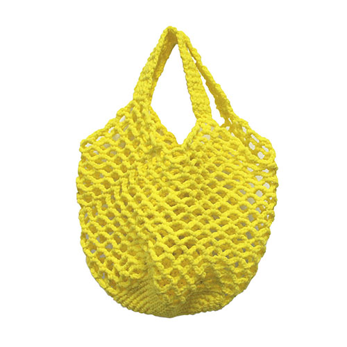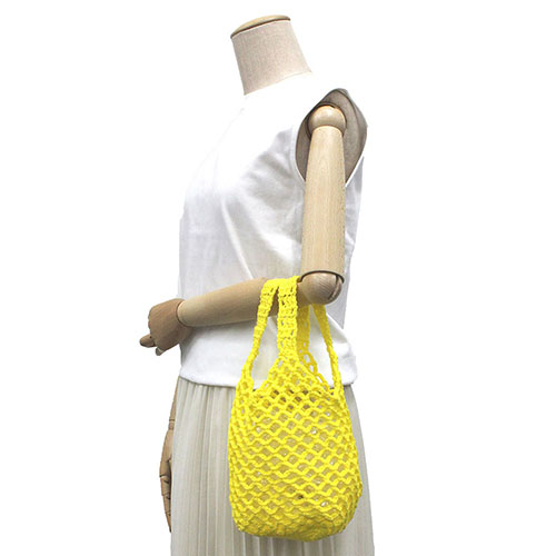 1玉で仕上がるネット編みのバッグです。底が四角いので、平らに持ちたいお菓子やランチBOXにもピッタリです。 パッと明るい色味も編んでいて楽しくなる大事なポイント! 素 材:ポリエステル100% 使用針:カギ針8/0号 サイズ:幅26cm 深さ16cm col=黄色 ヨーロッパの手あみ掲載作品 * 同品種(ヌーボラ)での、お色変更も可能です ご希望の場合は、コメント欄にお色変更の詳細を入力してください(在庫がある色に限ります)